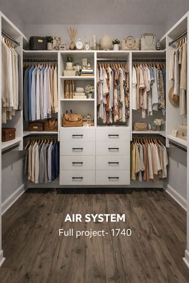 A functional mix of open shelving and built-in drawers for organized storage of clothing, accessories, and everyday items. Designed for versatility and a clean, modern look within the AIR Wall System..